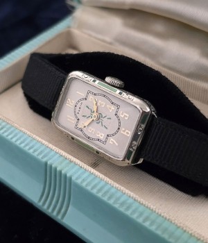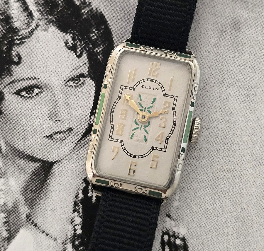 Deco-era Elgin wristwatches are always satisfying to study and offer to our clients. After all, the Elgin Watch factory was the biggest watch factory in the world, with its own jeweling house, watch college, and observatory stretching across city block after city block in the little town of Elgin, Ill. This progressive company spared no expense in finding the most talented artists and case designers to come up with a look that would set their watches apart from and, ABOVE, the rest.