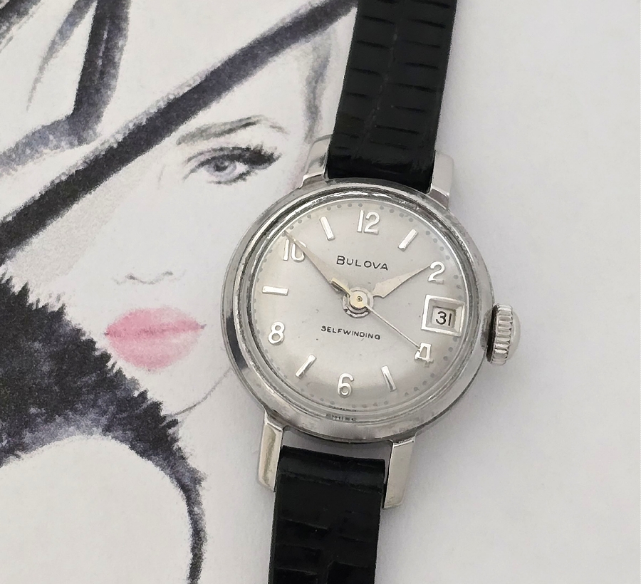 Measuring 28mm long by 21mm wide, this solid stainless steel rarity is as classic a mid-century timepiece as one could possibly hope for. An extraordinary platinum-tone dial looks like the day it was fitted at the factory, with silver-tone applied bar-and-dot markers and center-sweep with date function. Its brilliant "baton" hands and "Bulova" marked reeded crown also are perfect. The unengraved back snaps open nicely to an extraordinary machine: a freshly cleaned, oiled and regulated factory automatic movement – one of the smallest of its kind – fitted with 17 ruby jewels and marked "Bulova/17 jewels/unadjusted."