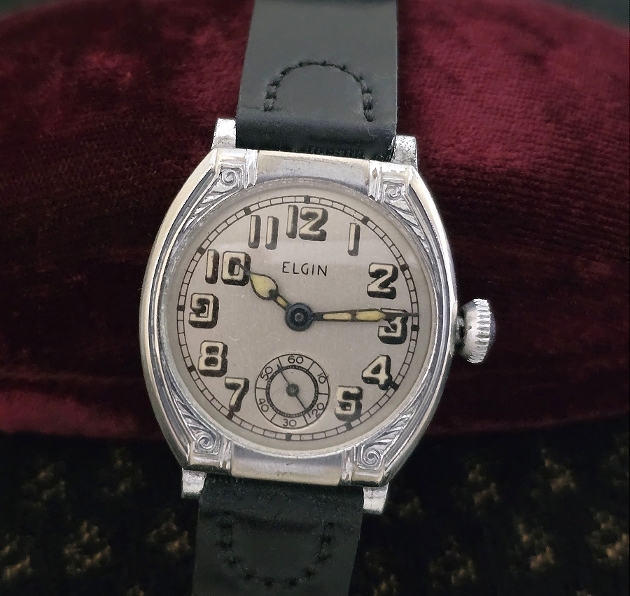 Deco-era Elgin wristwatches are always satisfying to study and offer for sale. After all, the Elgin Watch factory was the biggest watch factory in the world, with its own jeweling house, watch college, and observatory stretching across city block after city block in the little town of Elgin, Ill. This progressive company spared no expense in finding the most talented artists and case designers to come up with a look that would set their watches apart from and, ABOVE, the rest.