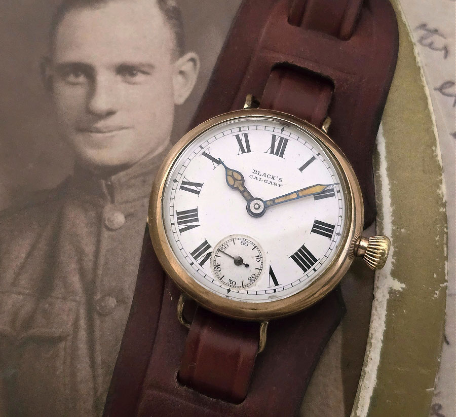 We are honored to offer this WWI era 1914 Omega wristwatch made for Black’s Jewelers in Calgary, Canada. Featuring its original yellow gold-filled, wire-lug case, its original porcelain dial which is highlighted by "stained-glass" hands, an outer minute track and desirable sub-seconds register. Signed "Black's Calgary" in trademark script, it is a stunning thing, quite possibly worn by a young man who served in WWI.