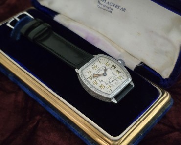 This substantial case opens to reveal a magnificent time-machine: a completely restored, fully calibrated 17 ruby jeweled mechanical mechanism that keeps accurate time as it was intended. Engineered during a time when the automobile still sported wooden spokes, this futuristic wrist-machine is glorious. Few mechanisms today are as well engineered as this example.