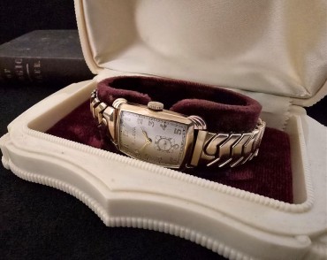 For example this Bulova '40s wristwatch with original pearlescent dial, gold applied Arabic numerals DEFINITELY embodies the current Golden Age movement. The sub-seconds register is a tip-of-the-hat to the previous era, while excellent feathered lugs on this rectangular gold-filled bezel are smooth and indicative of the transformation from Deco to a more muted Pre-War.