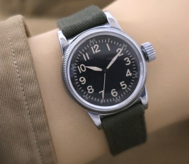 A few watches made it back to the states, most of which having been well used during the war. To find an A-11 is rare; to find one in excellent condition rare indeed, but to find a specimen in this mint condition? You may scour the world and not find another like it. This magnificent example of the Elgin A-11 Aviator's wristwatch is completely original and in mint condition. It measures 39mm lug-to-lug by 34mm in diameter and features a midnight black dial with white, oversized Arabic numerals, all crisp. Bubble crystal is beautifully transparent, with absolutely no scratches or inclusions. The white “spear” hands are handsome, the mint case is flawless, the cleaned, oiled and calibrated model "539" 16 ruby jewel Elgin movement is flawless. The crown is brand new old stock, original to the case, snapping nicely when pulled out; hack feature works perfectly, stopping the sweep second hand for synchronized timing. The chromed base metal case is beautifully engine turned with a coin, or "reeded" edge on both back and bezel. Back is engraved. "A.F. U.S. ARMY/TYPE A-11/Spec. NO. 94-27834-B/SER NO. AF45-22436/MFR'S PART NO. 2114/ORD.NO.W33-038AC-6600/ELGIN." We've outfitted the watch with a correct re-creation of the two-piece O.D. fabric strap it would have been issued with during or shortly after WWII. This piece is in the same pristine shape as a new watch issued to a pilot 50 years ago: a fine watch in incredibly rare condition.