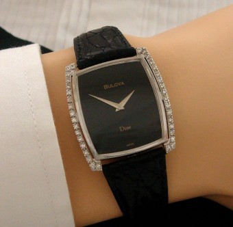 We’re never had this example and I must say, it’s rather fetching. Measuring approx. 34mm lug-to-lug by 30mm wide, it has a substantial wrist presence. Thirty-six diamonds totaling a bit more than a third of a carat light up either side of a magnificently restored jet-black dial which reads "Bulova/Dior/Swiss."
