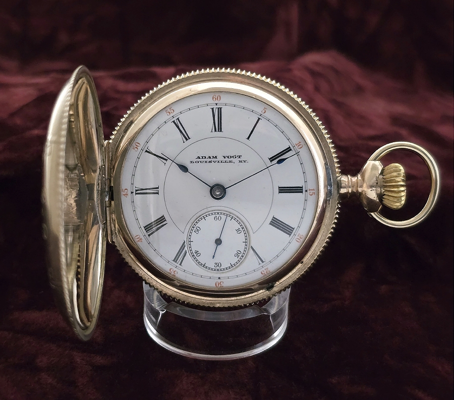 The watch was specially made by the Hamden Watch Company as a "Dueber-Grade" for Adam Vogt, Jeweler, of Louisville, Kentucky. A prominent jeweler and business presence in his day, Mr. Vogt was known for his dedication to his craft and clients, often sleeping in his shop to keep up with demand. Looking at this work of horological art, we can see why he was so popular.